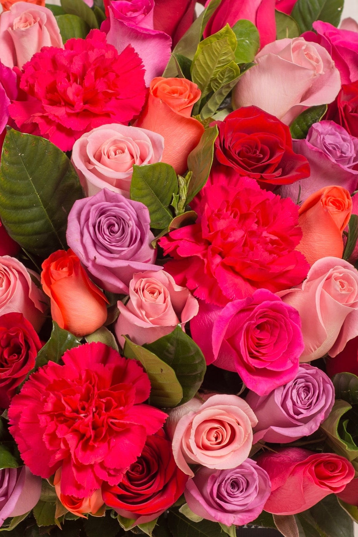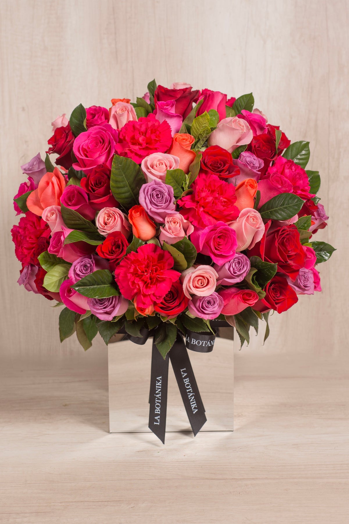Incluye: 115/120 rosas fucsias, naranjas, rojas, lilas y rosadas + Mix de Flores (Clavel importado , hoja de gardenia) + Tarjeta de dedicatoria.