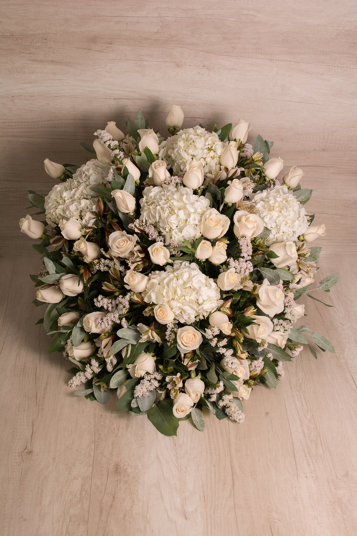 Incluye: Rosas Blancas + Mix de flores (Astromelias, Hortensias, Estatis, Eucalipto, etc) + Tarjeta de condolencias de 21cm x 25cm.