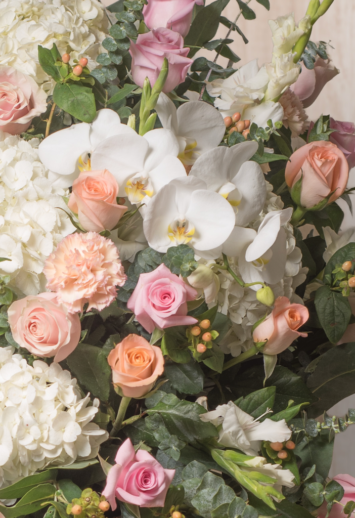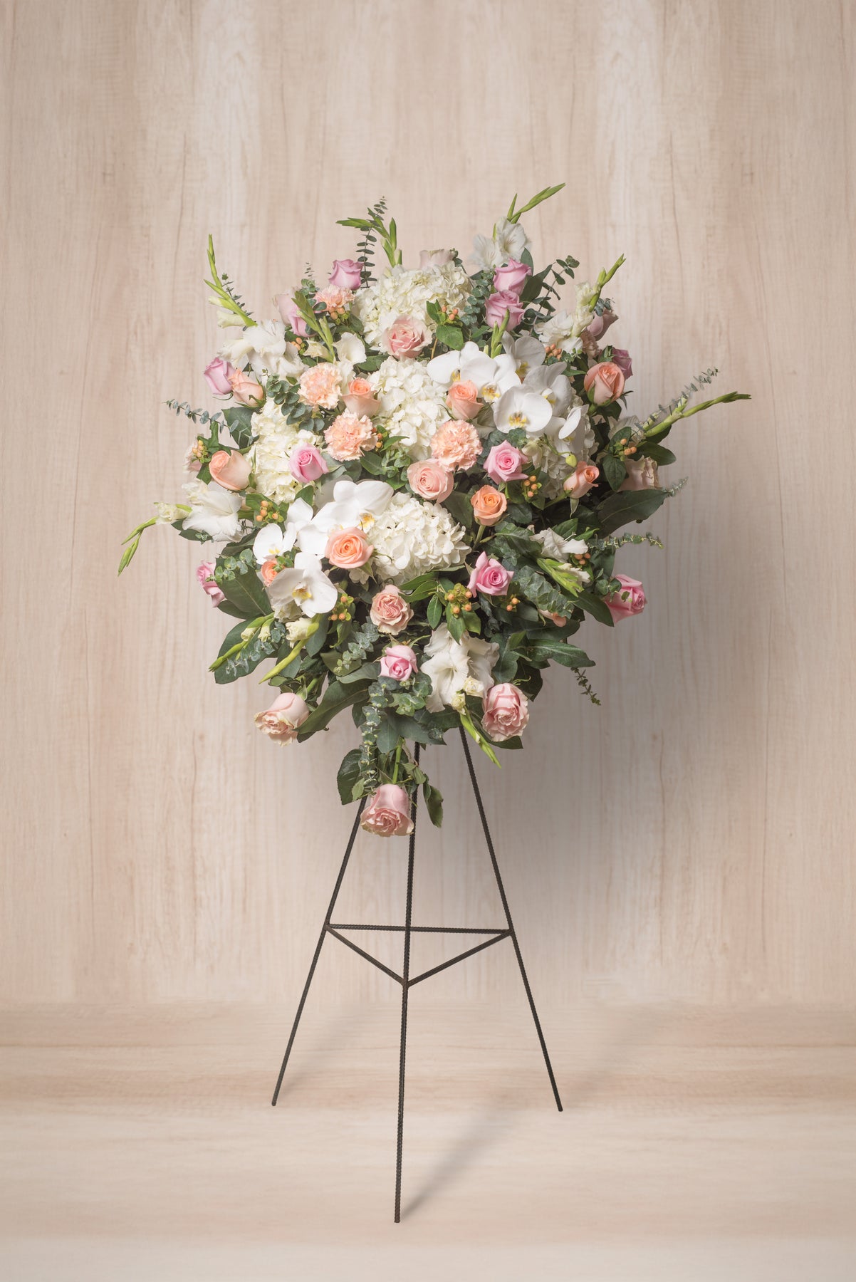 Contiene: Varas de orquidea premium + 30/35 rosas rosadas de distintas tonalidades + Mix de flores (hortensias, gladiolos blancos, claveles importados, etc) + Tarjeta de condolencias.