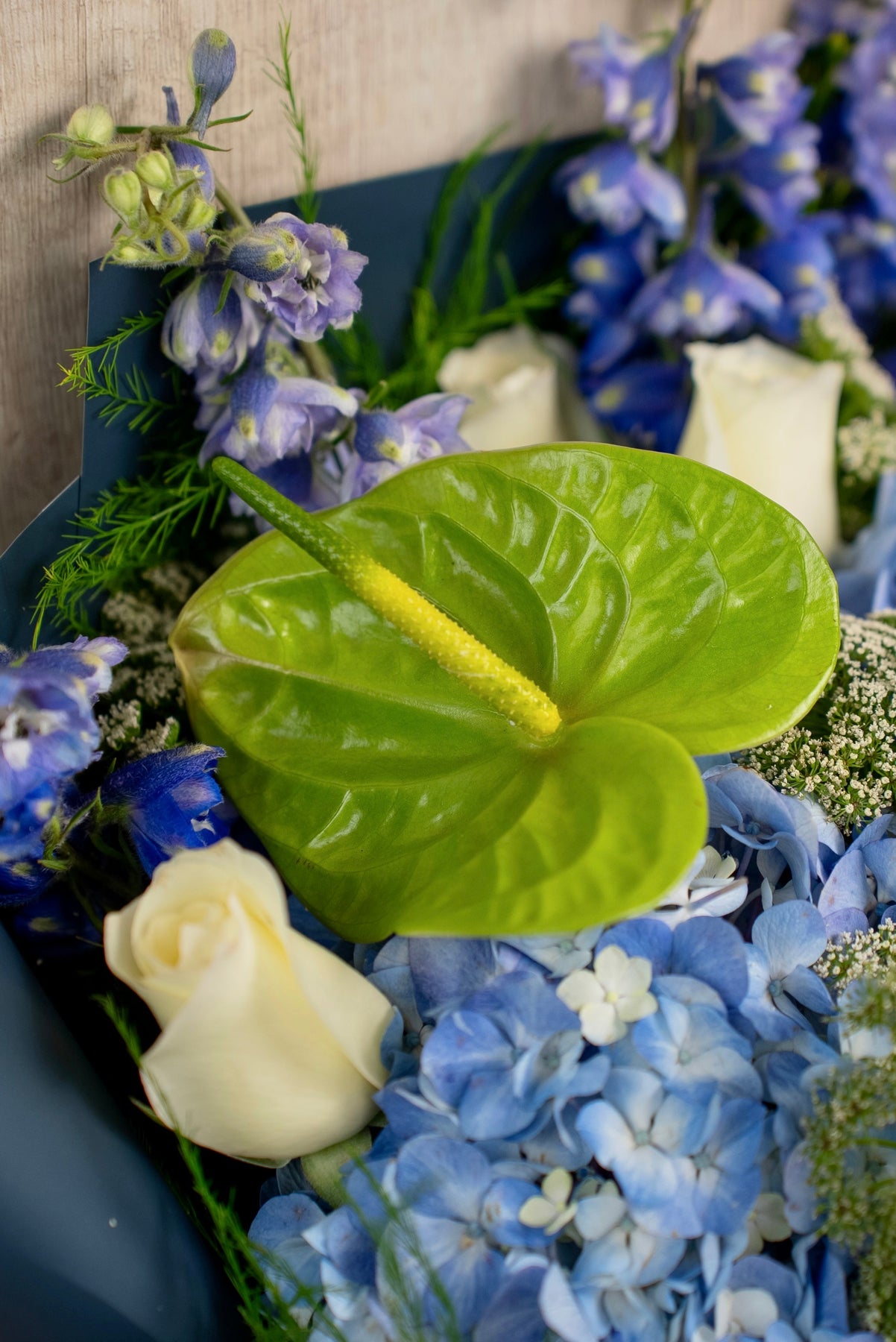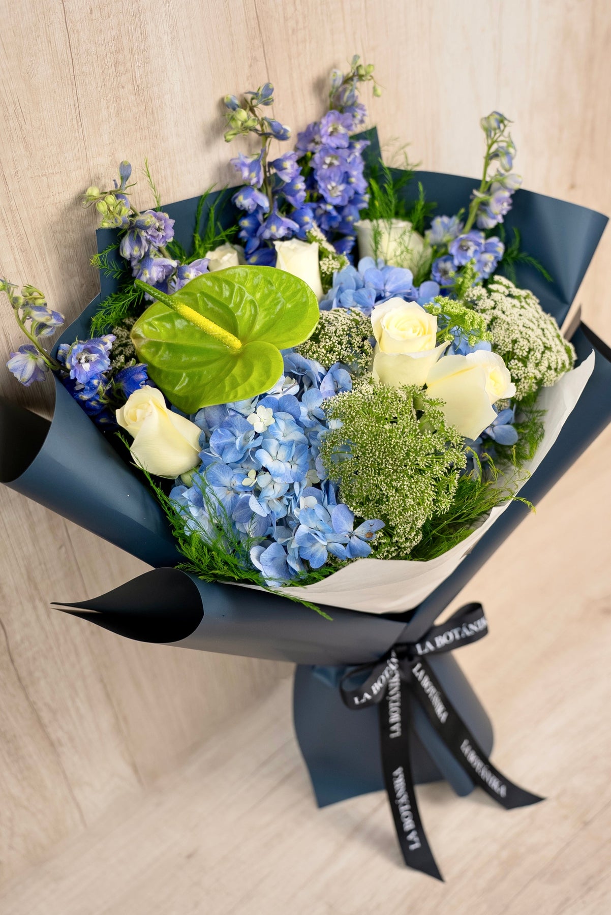 6 Rosas Blancas + Mix de Flores (Anturio, Delfinium, Hortensia, etc).