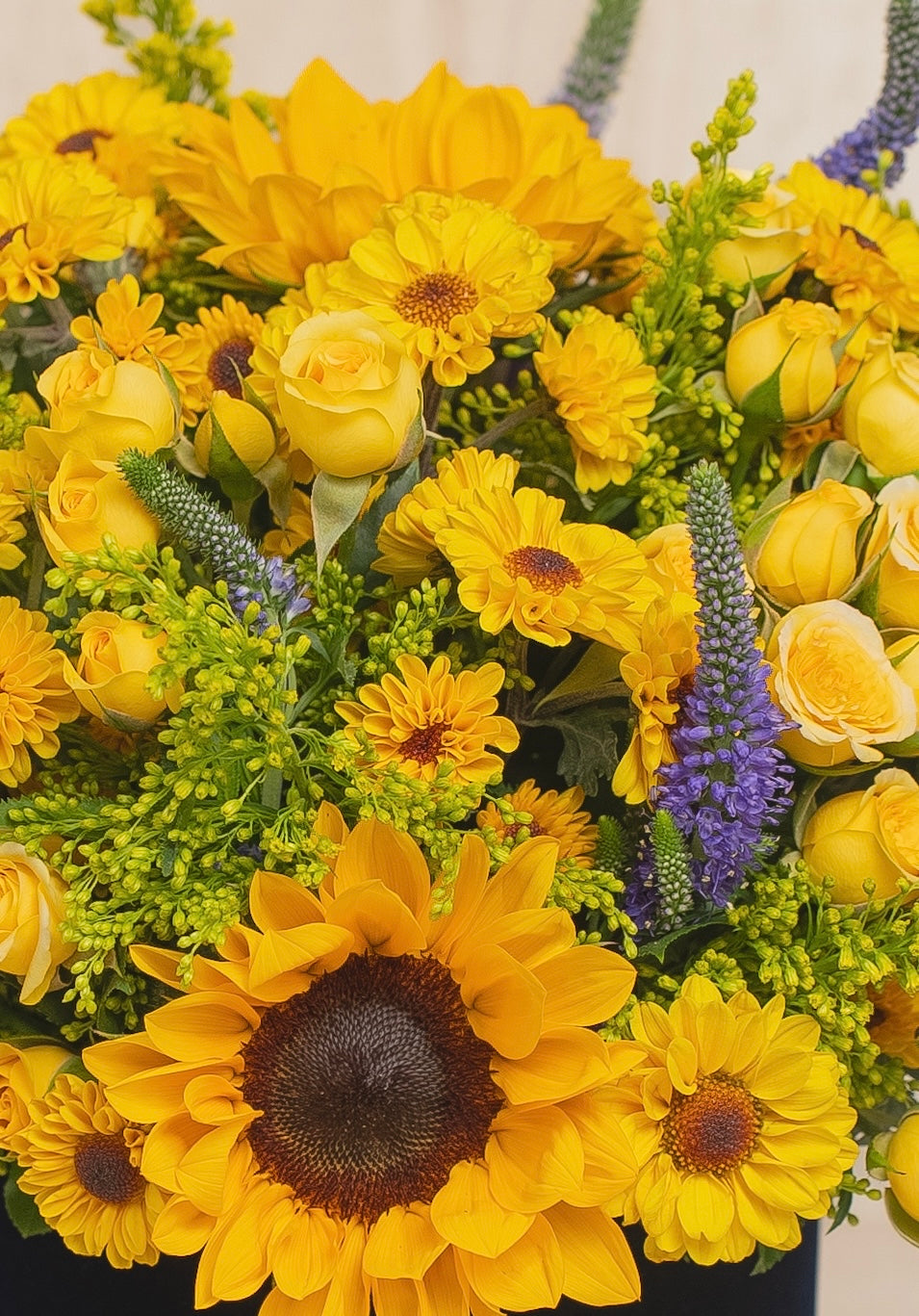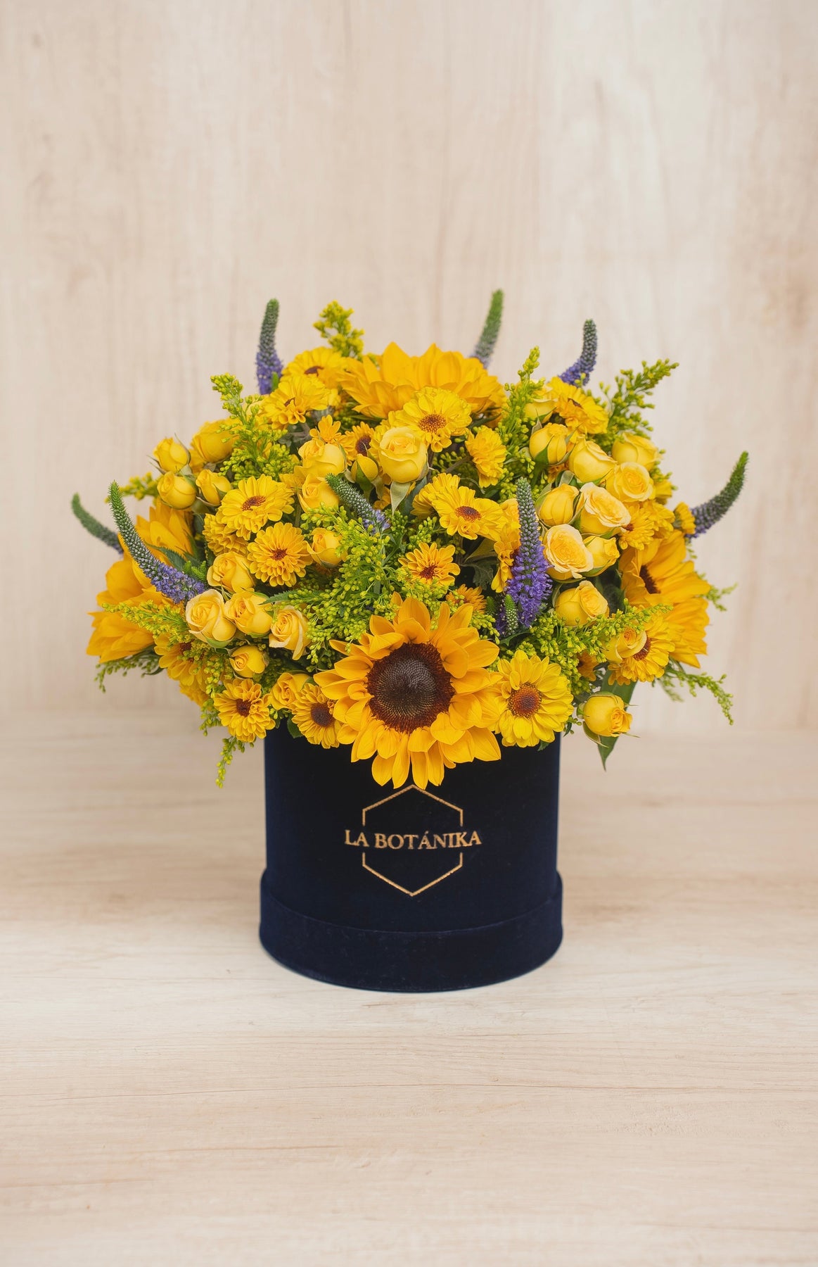 Caja redonda de terciopelo azul + 5 Girasoles + Mini Rosas amarillas + Mix de flores (Verónicas, Stilver, Variedad de mini girasol, etc.).