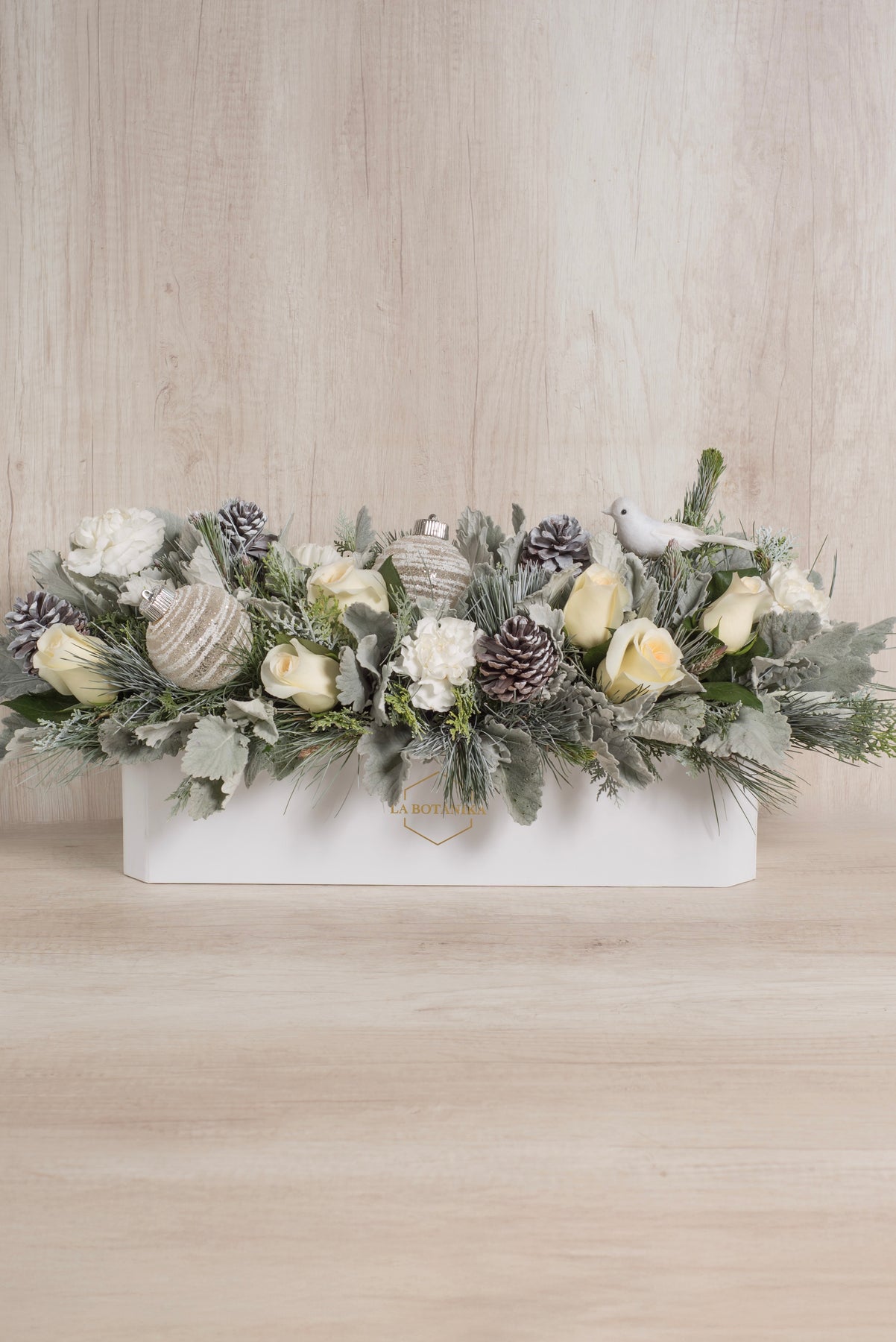 Caja rectangular blanca + 12 rosas blancas + 2 bombas navideñas importadas + pájaro blanco + Mix de flores (Sineraria, Piñas, Pino, etc)