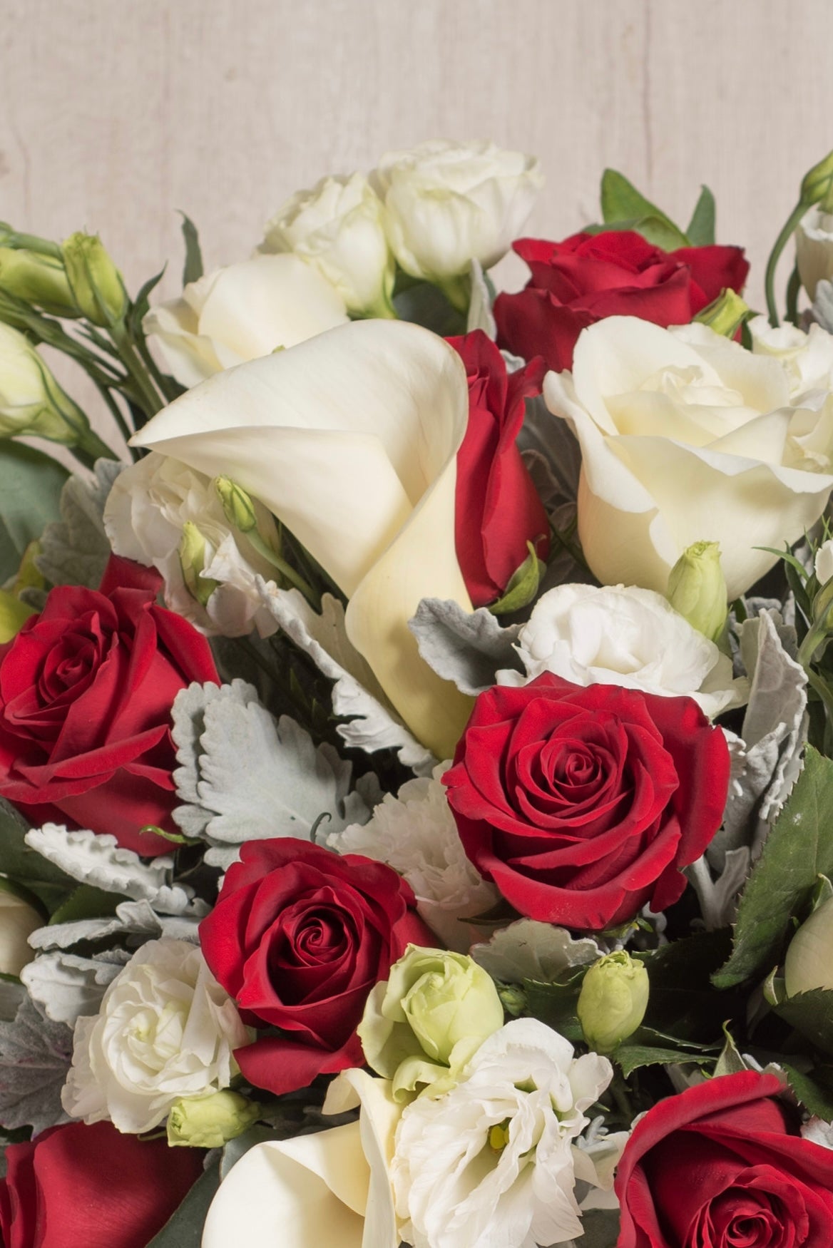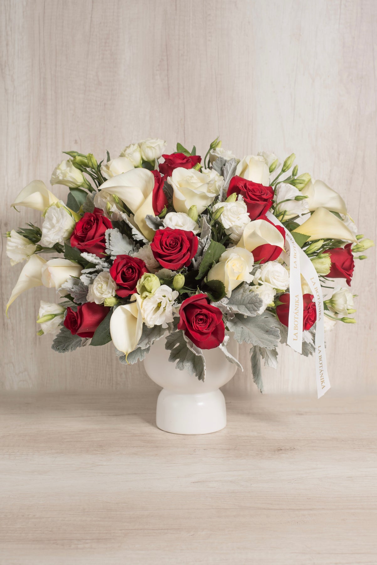Copón de cerámica importado blanco + 18 rosas rojas y blancas + cartuchos blancos + Mix de flores (Lisianthus, Sineraria,etc) + Tarjeta de Navidad personalizada.
