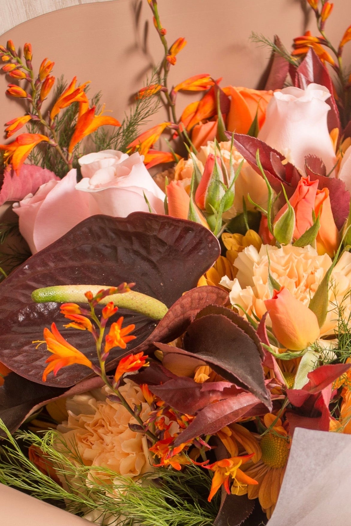 Incluye: 1 Anturio + 6 Rosas rosadas + Mix de Flores (Potinia, gladiolina naranja, clavel importado, margarita ocre, espárrago triple, etc) + Tarjeta de dedicatoria.
